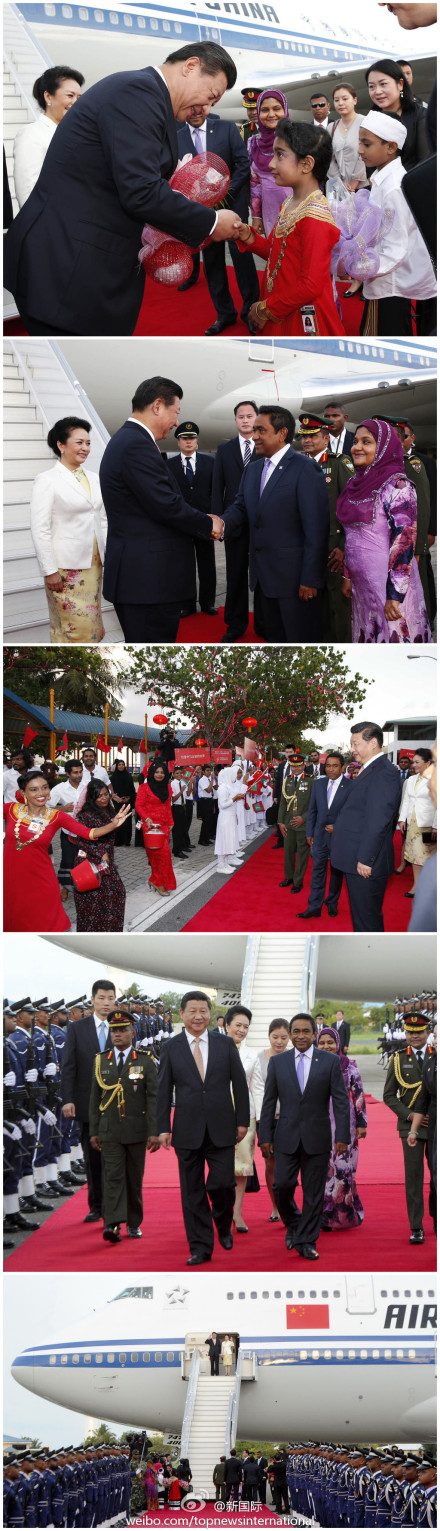 中新网马累9月14日电(记者 张朔) 当地时间14日下午5时50分许,中国国家主席习近平和夫人彭丽媛乘专机抵达马尔代夫首都马累,开始对马尔代夫进行首次国事访问。