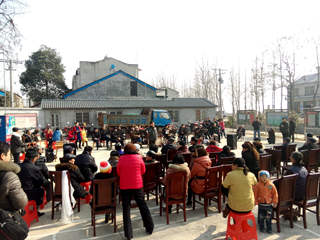 28日上午,万庾镇重阳村村部传来阵阵掌声。来自县京剧票友协会和该镇老年人协会的演员们献上了民乐合奏、花鼓戏、京剧等类型共20多个节目,吸引了周边数百名群众前来观看。《红灯记》、《智取威虎山》、《沙家浜》等经典剧目或精彩片段掀起表演高潮,赢得了阵阵热烈掌声。图为表演现场。(蔡建业)