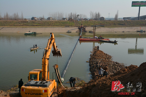 管道能否顺利落到水下管槽沟是施工的关键。10时许,记者在施工现场看到,隔河相对的两台挖机张开手臂牢牢地牵引着跨河输水管道的钢丝绳,长120米、直径为0.63米的硕大输水管道如一个巨大的一字横卧在华容河中。河中央,浮船一动不动静静地护着钢管不让偏离。10时30分,工程项目负责人一声令下,开始往输水管道内注水,10分钟后,注水处管道开始缓慢下沉,河中技术员2人一组划船不停比对和检测偏离方向。