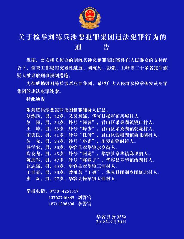 关于检举刘练兵涉恶犯罪集团违法犯罪行为的通告