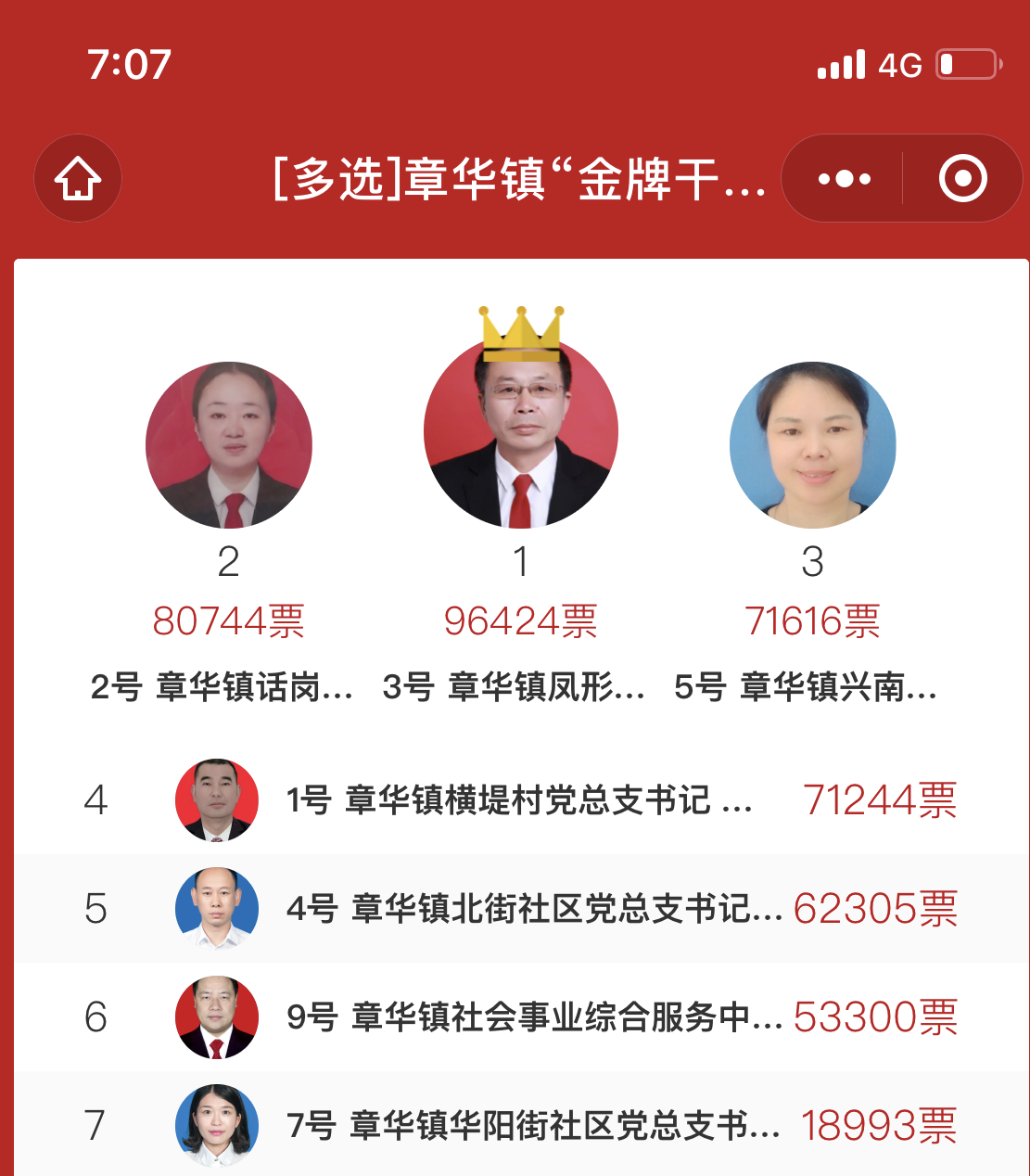 该系列评选活动于4月中旬启动,分为摸底报选、联合审查、评议审定、表彰宣传等四个阶段,主要通过网络投票的方式,评选出“金牌支部、金牌党员、金牌干部、金牌乡贤”四块“金牌”。经申报初审,入围“金牌支部”提名对象8个、“金牌党员”提名对象16名、“金牌干部”提名对象12名。镇党委结合网络投票结果,分别评选出“金牌支部”3个、“金牌党员”10名、“金牌干部”5名,并在全镇“七一”大会上予以通报表彰。